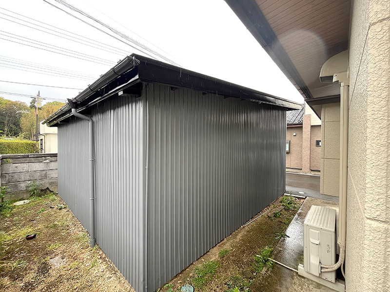 落ち着いたグレーに塗り替えた、かっこいい車庫