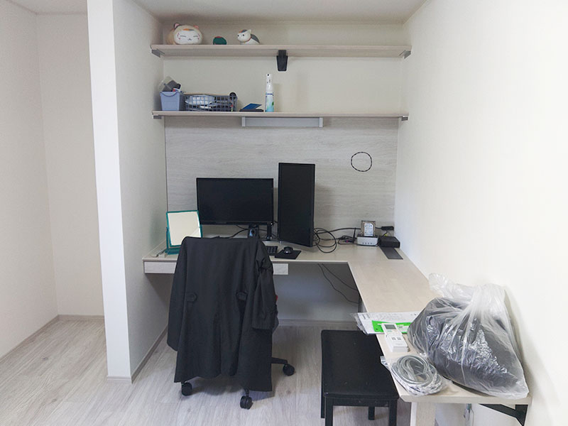 L字の造作デスクを付けたいとの事でしたので、お客様と密に打合せをさせていただき、インテリア商材で造作工事をさせていただきました。